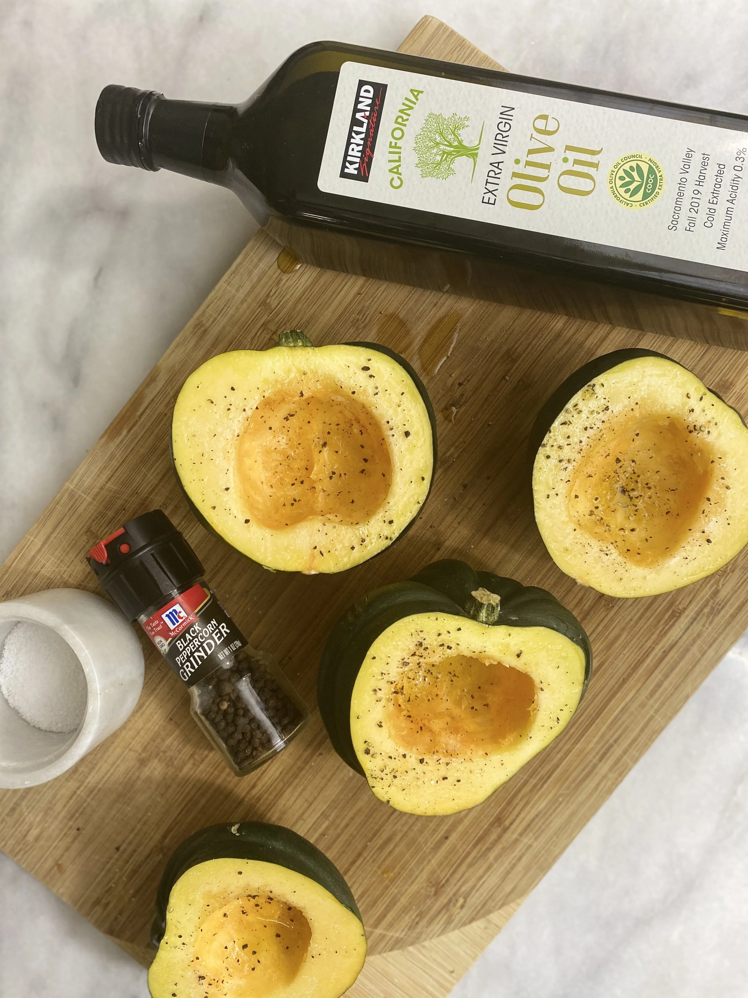 - Cut both the acorn squash in half and scoop out the seeds and stringy parts. Brush on 2 tbsp olive oil and season with salt & pepper. Place on a baking sheet with cut sides up into the oven for 40-50 minutes until tender. Remove from the oven and let cool for 10 minutes.