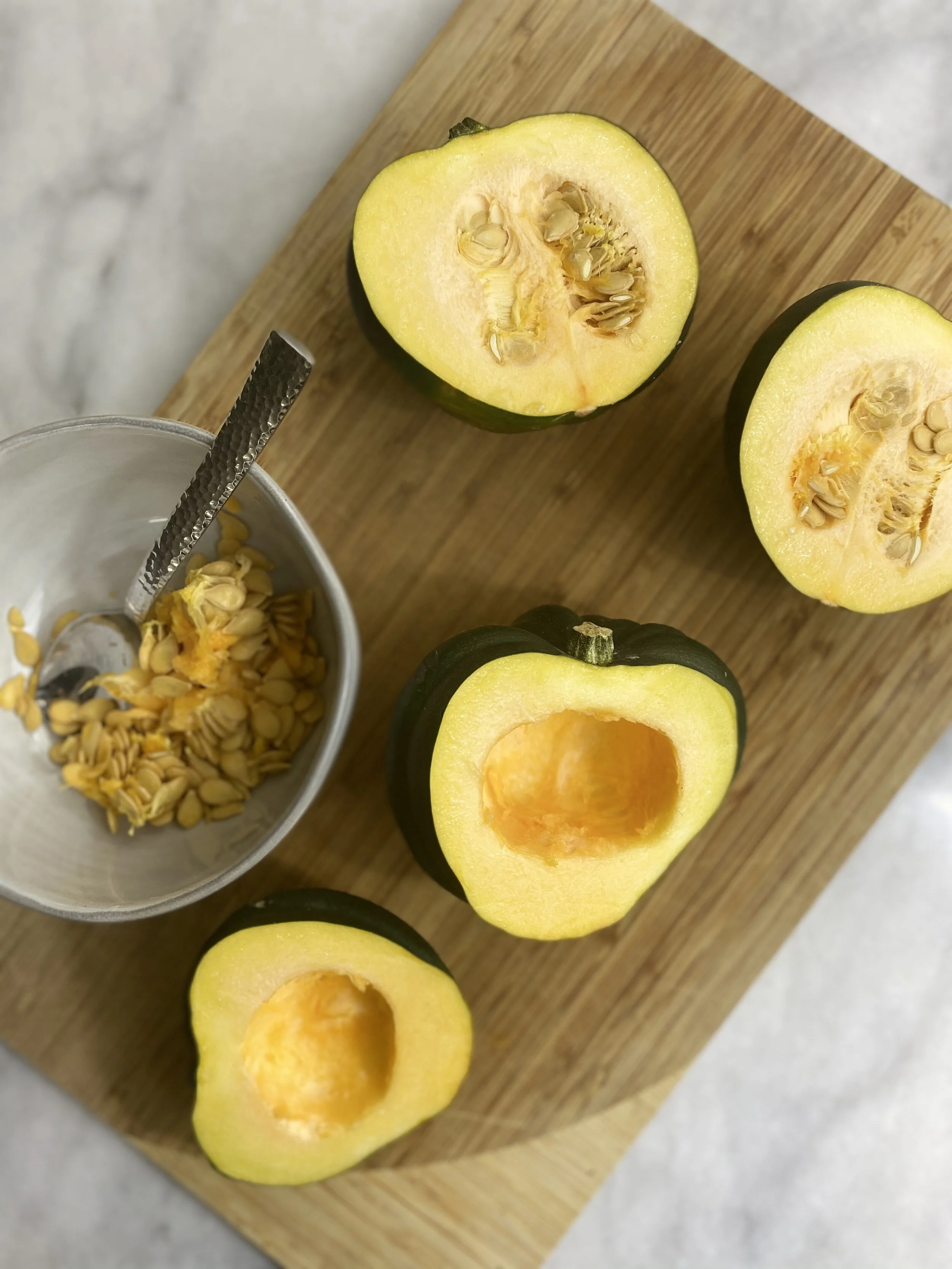 First, cut both the acorn squash in half and scoop out the seeds and stringy parts.