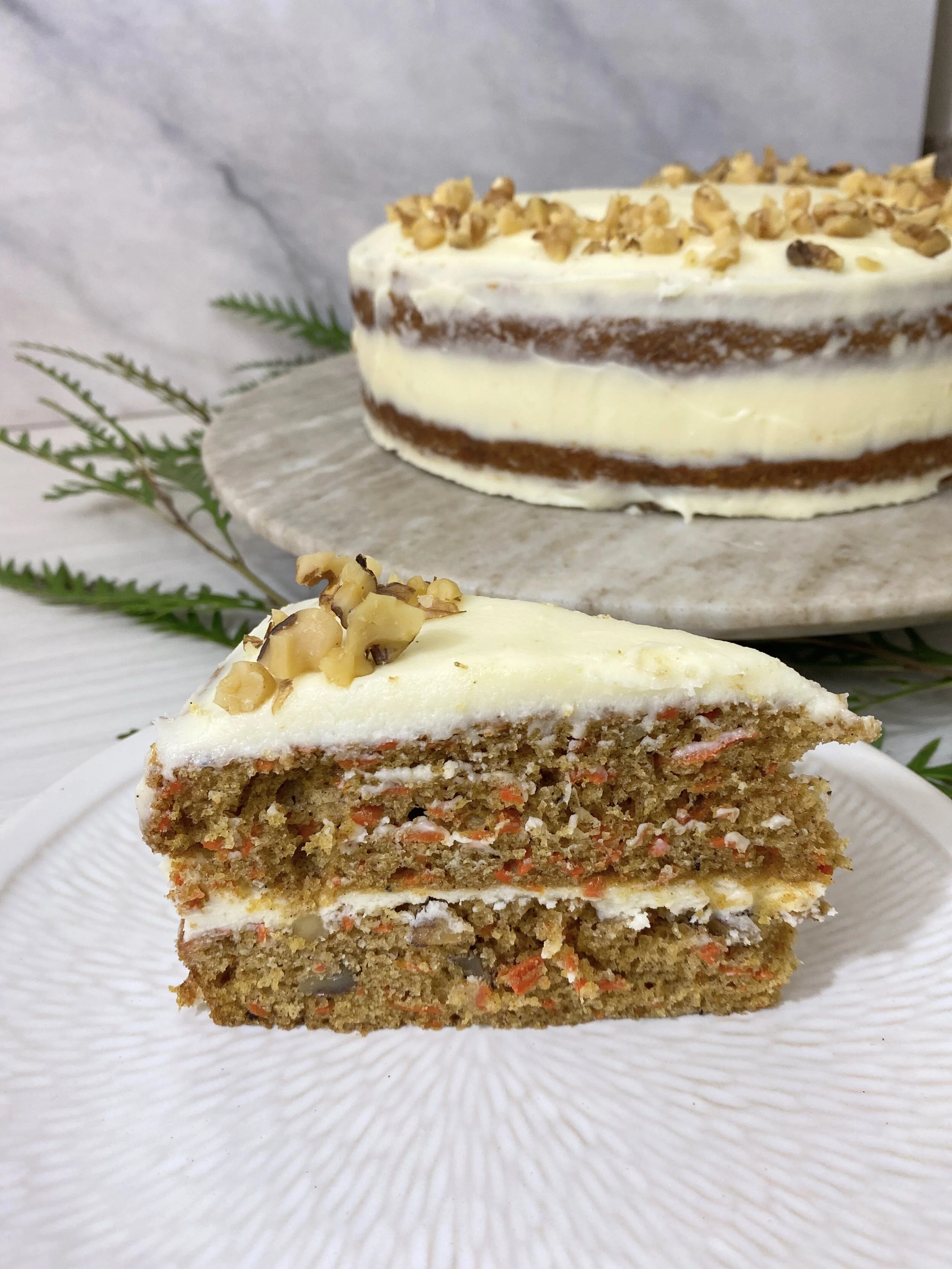 A moist and heavenly cake with delicious layers of shredded carrots, warm spices and walnuts in every bite.