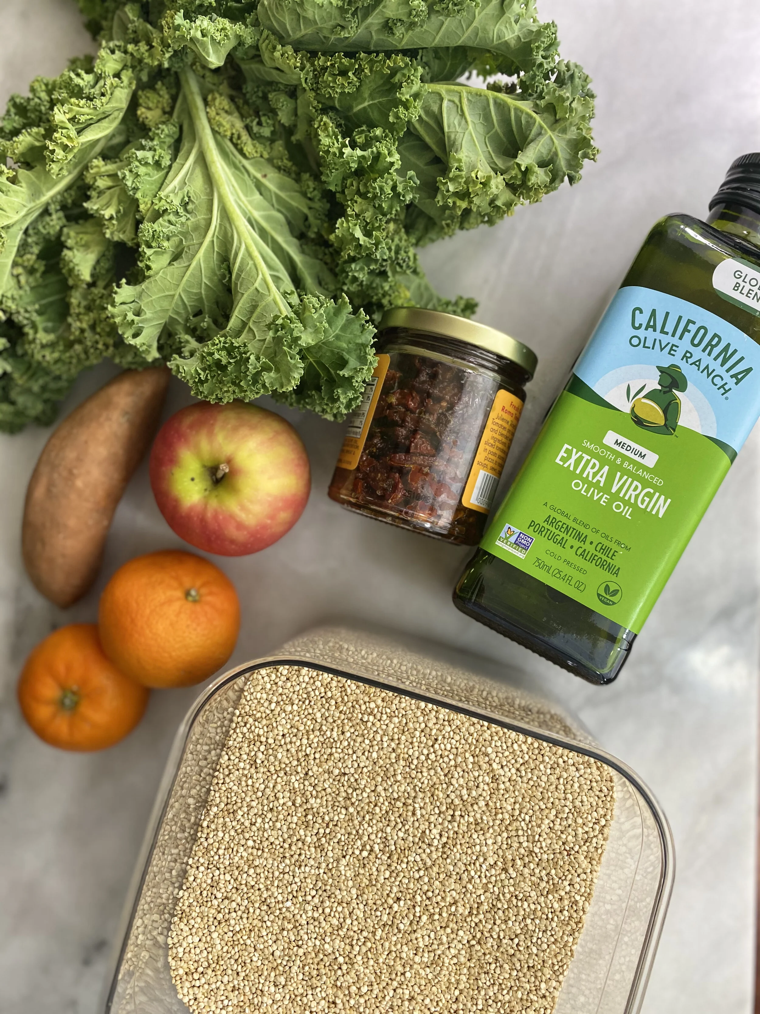 Transfer the chopped kale into a bowl, add the sliced apples, peeled mandarin oranges, cooked quinoa, roasted sweet potatoes, semi-dry sun-dried tomatoes. Pour your choice of dressing and toss everything together. Transfer some in a bowl and enjoy!
