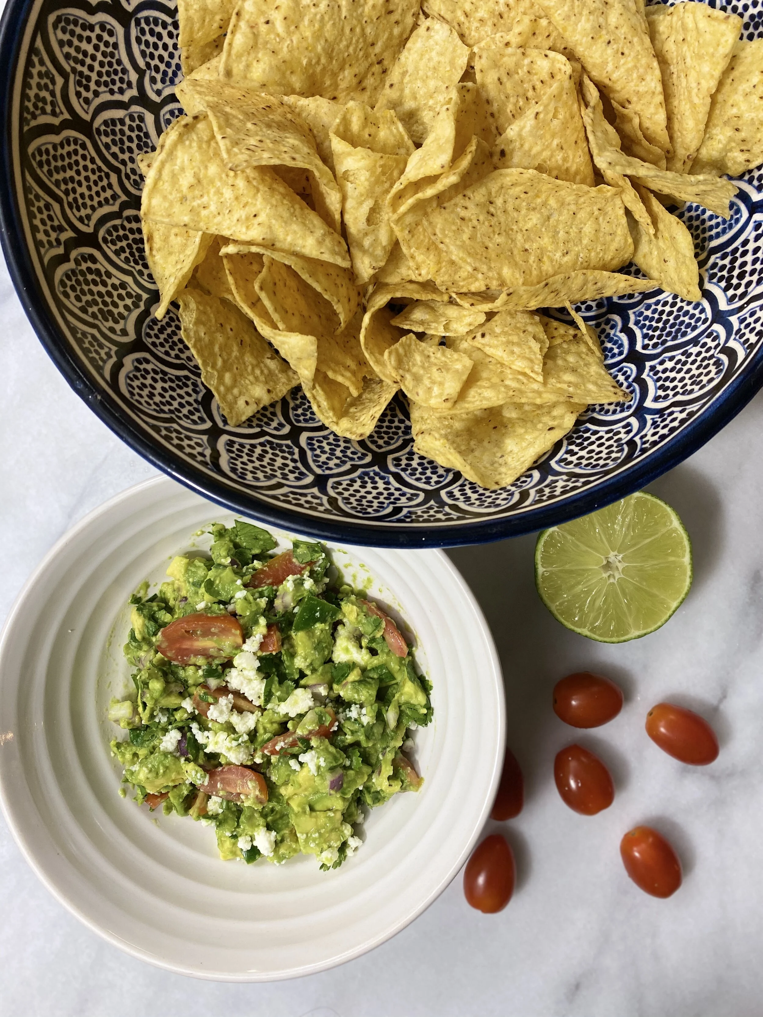 MY FAMOUS GUACAMOLE PrintWith ImageWithout ImageMy Famous GuacamoleYield: 4Author: Yasmine WahabPrep time: 15 MinTotal time: 15 MinIngredients2 Hass Avocados, Diced & Mashed5-6 Cherry Tomatoes, Quartered1/2 Small Jalapeño, Diced1/4 Small Red Onion, Diced1/4 Cup Cilantro, Chopped1 Small Lime, Juiced1 Garlic Clove, MincedSalt & PepperQueso Fresco (OPTIONAL), for toppingInstructionsDice and mash 2 large avocados in a medium bowl. Add the quartered cherry tomatoes and chopped jalapenos, red onion and cilantro. Mince a clove of garlic and add to the guacamole mixture and the juice of a lime. Sprinkle with salt & pepper and combine. Garnish with some queso fresco and enjoy with your favorite tortilla chips.Recommended Products:Granite Mortar and Pestle Set guacamole bowlLemon Lime Squeezer - Manual Citrus Press JuicerSimilar RecipesDILL TAHINI YOGURT DIPHOMEMADE SPICY SALSABLACK BEAN HUMMUSDid you make this recipe?Tag @whisk_n_whip on instagram and hashtag it #recipesbyyas Appetizers/SidesYasmine WahabAugust 14, 2020superbowl, cinco de mayo, mexican, dip, summer, holiday weekend Facebook0 Pinterest0 0 Likes