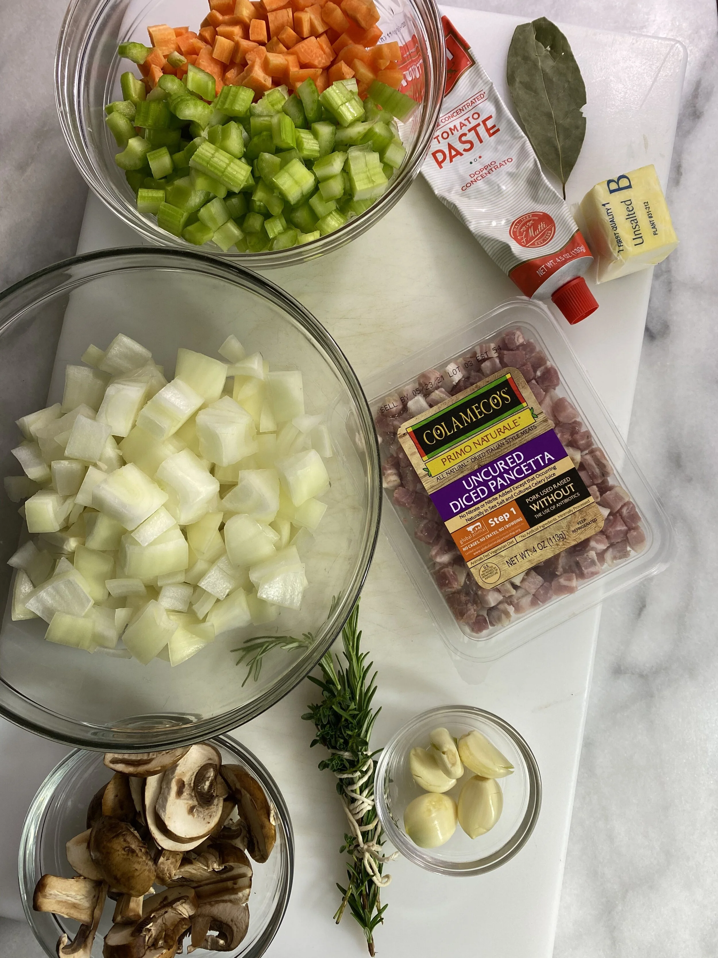 Add the onion, celery and carrots in the same pot. Cook for 2 minutes then add the diced pancetta and garlic. Cook for an additional 2-3 minutes, stirring everything frequently. Add tomato paste and combine everything then add mushrooms, red wine, bay leaf and a sprig of herbs (rosemary & thyme combined). Bring to boil then cover and turn to low heat and let simmer until meat is tender for about 2 hours. Remove the lid and add butter. Remove the bay leaf and bunch of rosemary and thyme. Season with salt & pepper to taste.