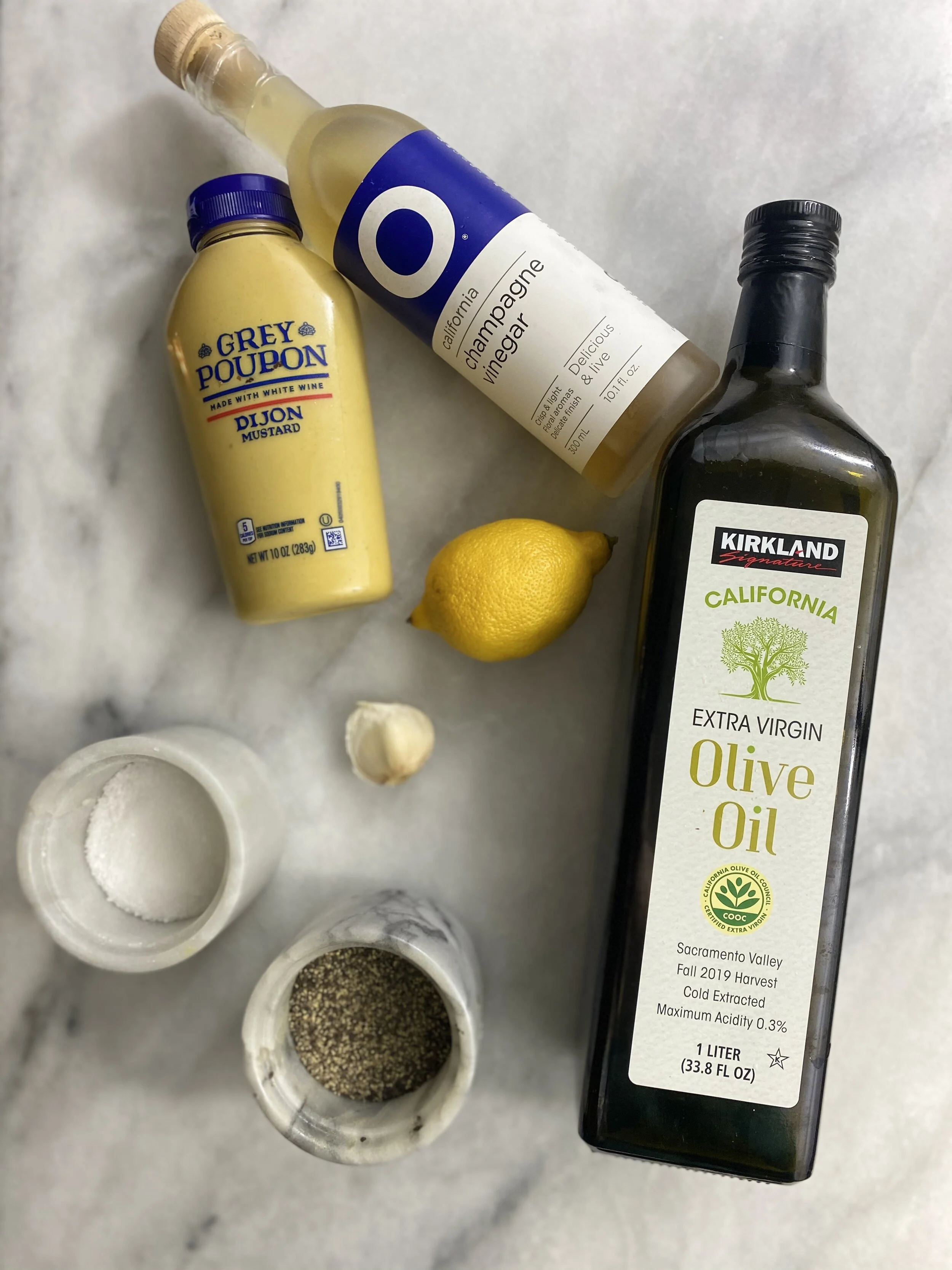 Meanwhile, make the vinaigrette. Place the champagne vinegar, olive oil, garlic, dijon mustard, lemon juice, salt and pepper in a small bowl and blend with an immersion blender. Set aside.
