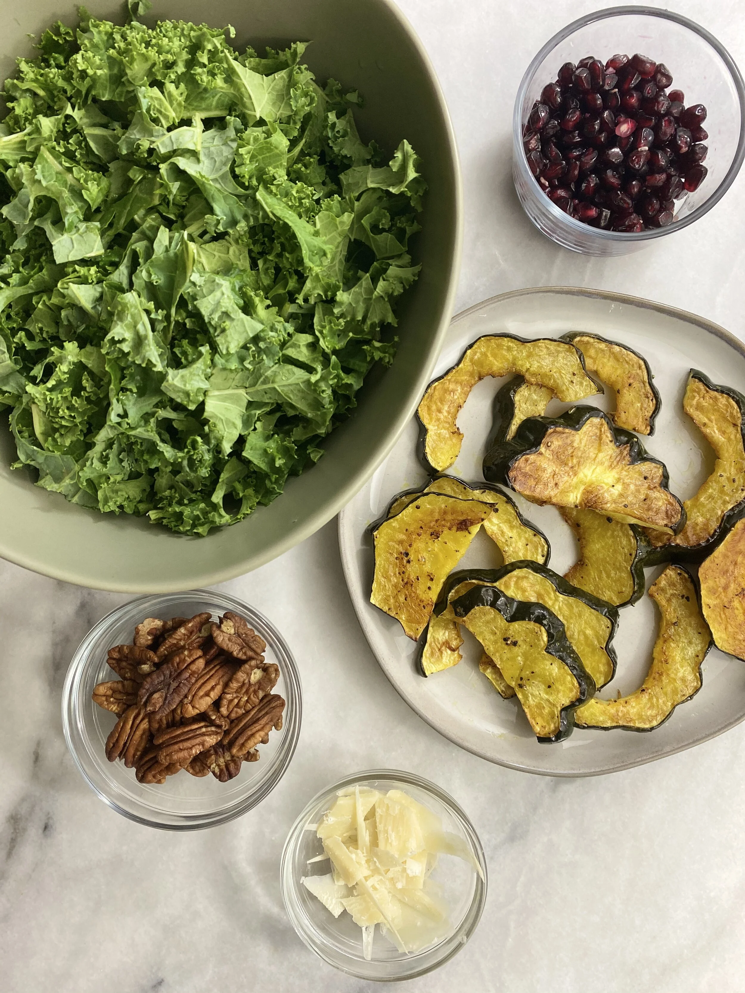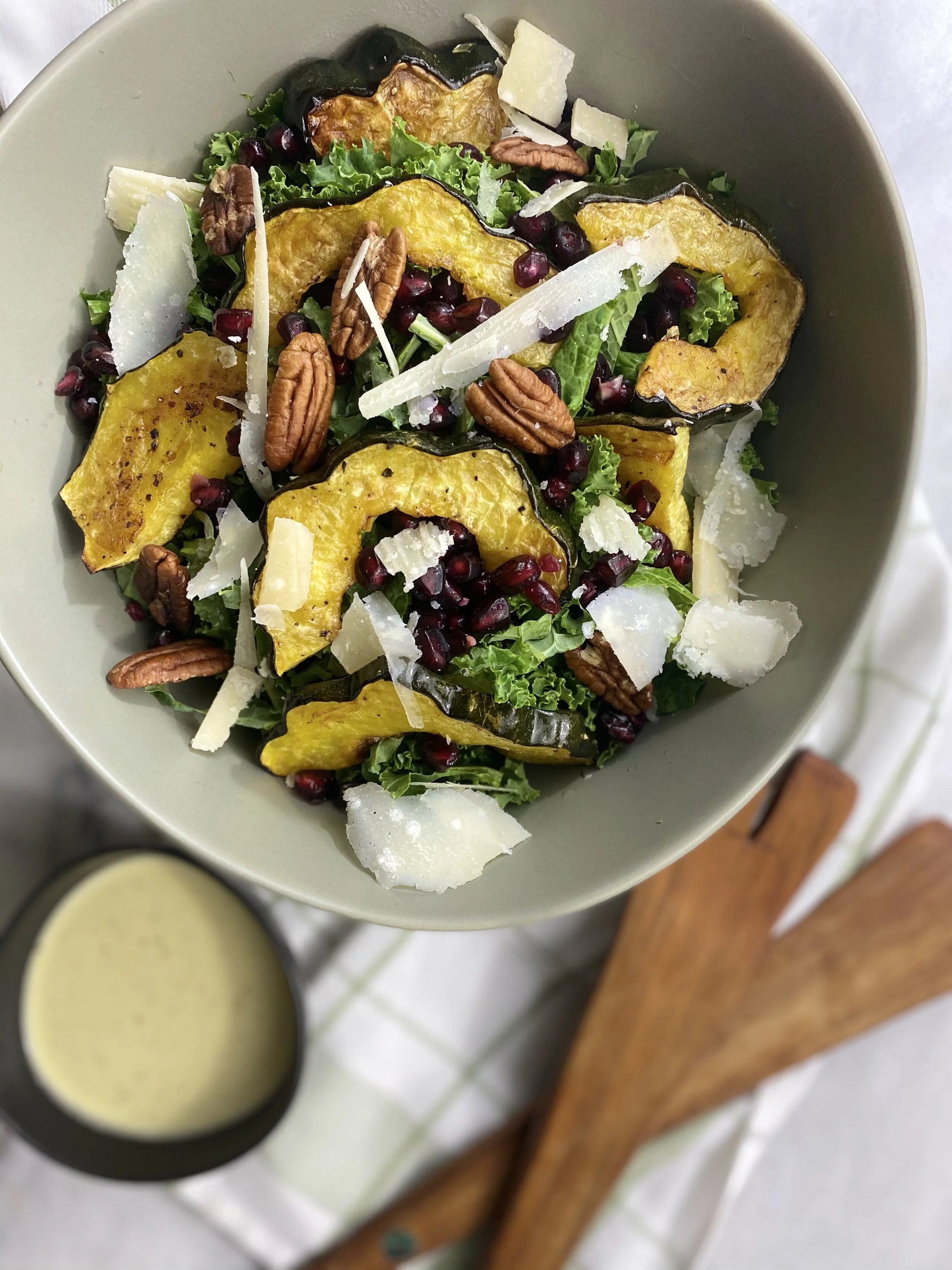 Wash the kale, remove the stems and roughly chopped then transfer into a large bowl. Add the pomegranate seeds, parmesan, pecan and roasted acorn slices. Pour half of the vinaigrette and toss.